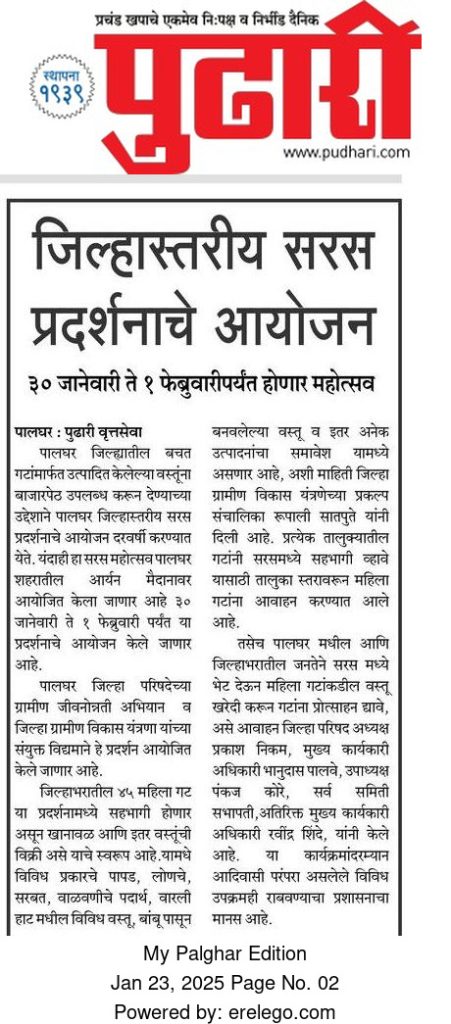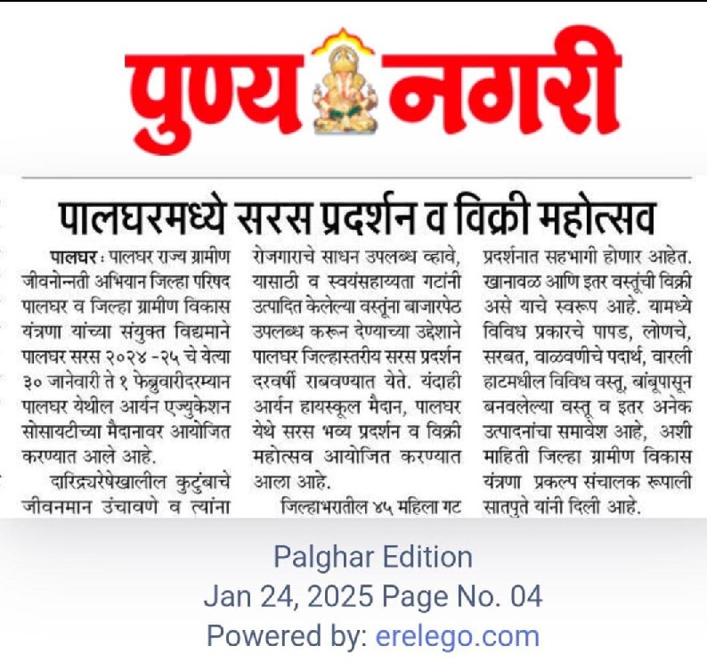 पालघर राज्य ग्रामीण जीवनोन्नती अभियान जिल्हा परिषद पालघर व जिल्हा ग्रामीण विकास यंत्रणा यांच्या संयुक्त विद्यमाने पालघर सरस 2024 – 25 चे येत्या 30 जानेवारी ते 1 फेब्रुवारीदरम्यान पालघर येथील आर्यन एज्युकेशन सोसायटीच्या मैदानावर आयोजित करण्यात आले आहे.